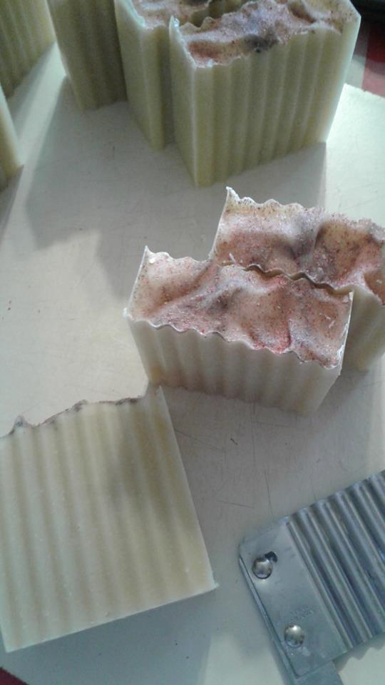 Congrats on successfully making “Snow Cherry” Soap Bars. This is a rich lathered bar with a light cherry scent topped with my home grown, dried and ground red current skins on top for extra pop of color. They loved the crinkle cut over the straight cut.. so be it.. It is nice indeed.