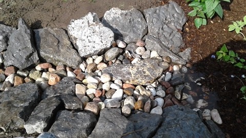 Now we needed to build a dry creek bed overflow into the pond.. The sides of the made stable with the very large rocks and then the river rock fills the bottom.. there is a nice flat on each side that allows you to use them to step on and cross of the wee creek (haha) if you need to do so.