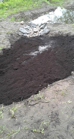 Now the pond was dug down and leveled with rounded swaying sides to make it look more natural. Nature was helpful, it rained and showed us where we needed to level more and that it collected the rain nicely and VERY important, it showed that it drained that water in 12 to 14 hours.