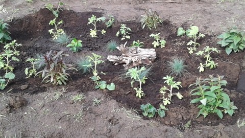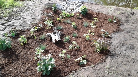 The different layers have different plant choices based on how much they can handle wetter feet vs drying out at times.. Then we needed to mulch it down to help present seeds from blowing in an starting.