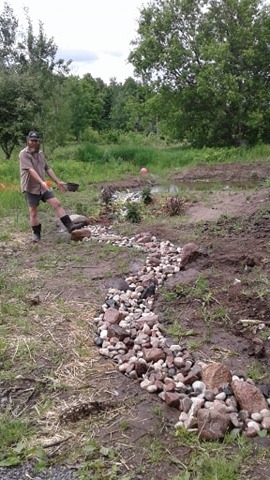 This creek collects from one side the house, from the driveway and from across the pasture.. it leads down and around the rain garden and then moves from the rain gardn to the overflow which takes it directly into the pond itself.. which has a overflow on the back of it that leads to the wetland area in the food forest.