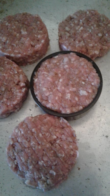 Try and work with very cold meat, now I used my handy little small patty maker, I have a bigger burger one as well, the joy of them is that they are all the same size, which makes single tray freezing them and stacking them a dream for future use and makes cooking them very easy as they are all the same in the pan.. plus they are lovely flat and much easier to cook because of it.