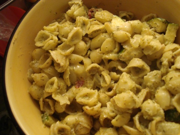 Put in a container and blend with hand stick, makes a nice thick light green sauce. Cook a pot of pasta, whatever kind you like.. I did small shells for this one..