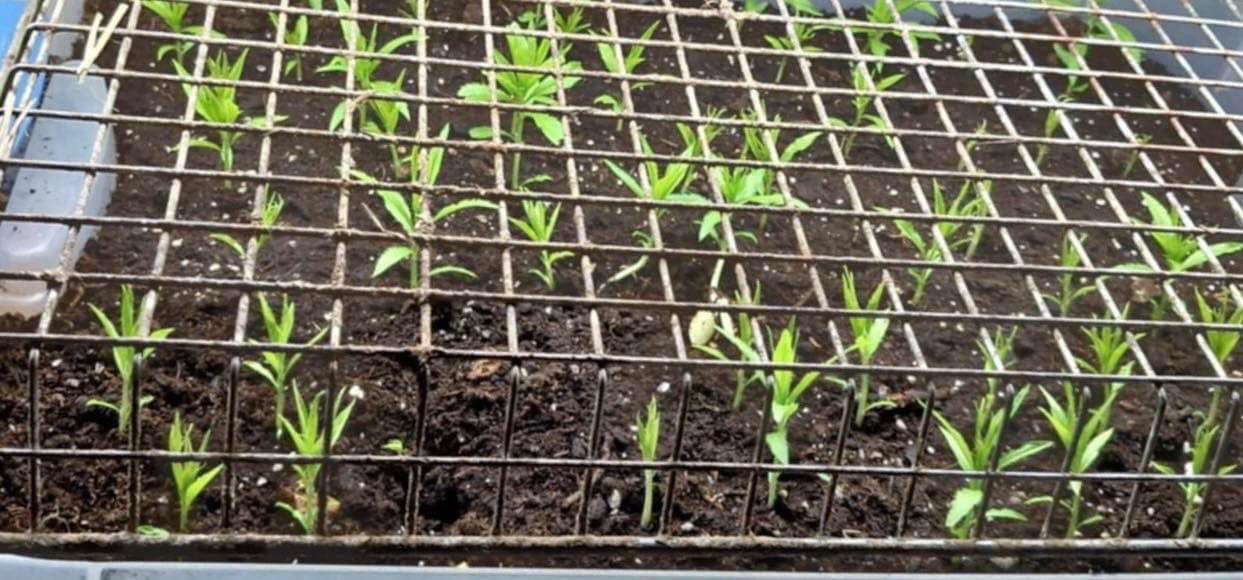 Trays and rows of peach babies are all popping up, remember to plant the tail side down when potting them up, i have held them as long as i could and i have them on a 10 on and 14 hours off as i am working hard to limit their growth due to how early in the year it is, once they all get potted up into their own pots, they are going to be taking up a huge amount of room and right now i am just using the air movement from the furnace but will add in a fan soon enough.