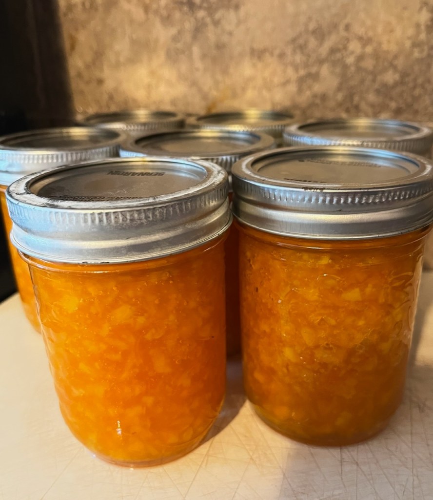 Into the bottom pot for my Steam Juicer Set (the bottom pot makes the best jam/jelly pot) went the diced orange and measured out 7 cups of sugar, 1 tsp of salt. Bring to a simmer boil and away it goes, it took me 50 minutes at the simmer boil to get it to the thickness i wanted.