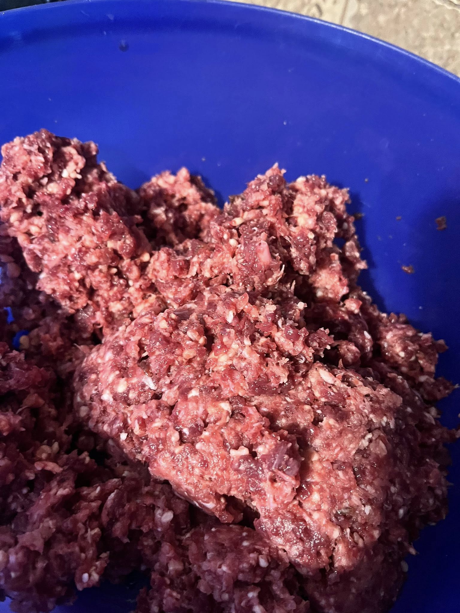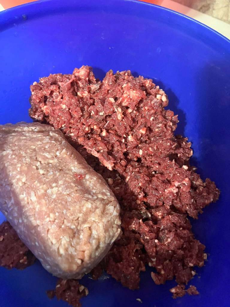 Now, that is long yearling grass fed ground beef, its coming on over a year in the freezer but its excellent condition and look at the difference between it and the ground heart from the same animal, if you are following the rules on these things, its a straight 80/20. I don’t know why, i just know that book after book after book tells me that you should use 20 ground heart to 80 percent ground meat to get a mix that NO ONE can tell they are eating heart in there, while still getting some of the health add in on the final product.