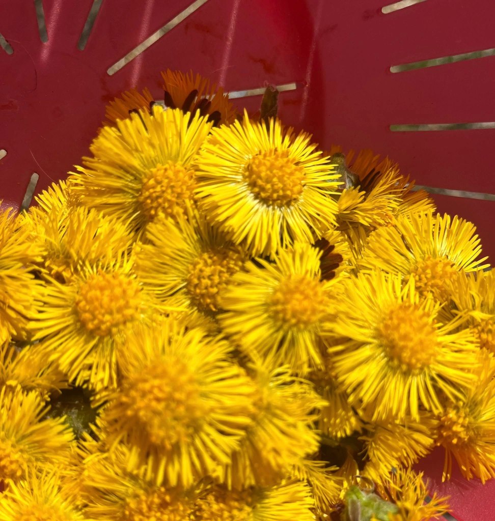 Its that time of year that the coltsfoot blooms are up and out on the sunny days, they come out before the leaves and while its a very good idea to dig out the creeping roots in your spring garden clean up, its also time to pick and redo the cough syrup.