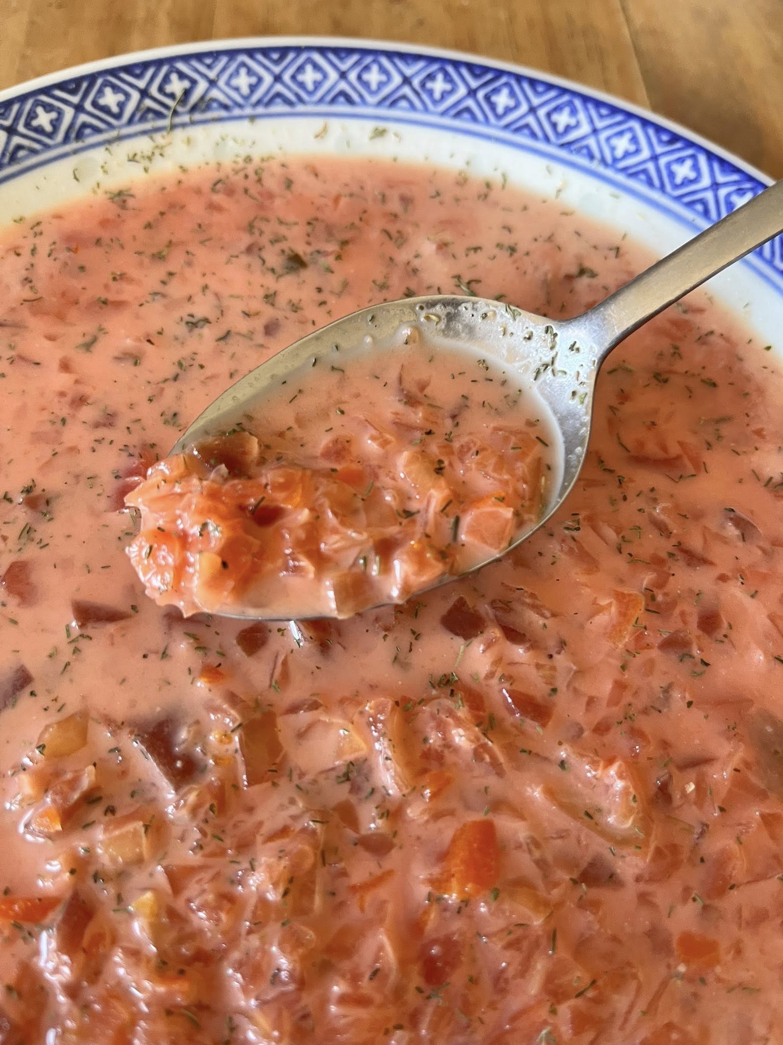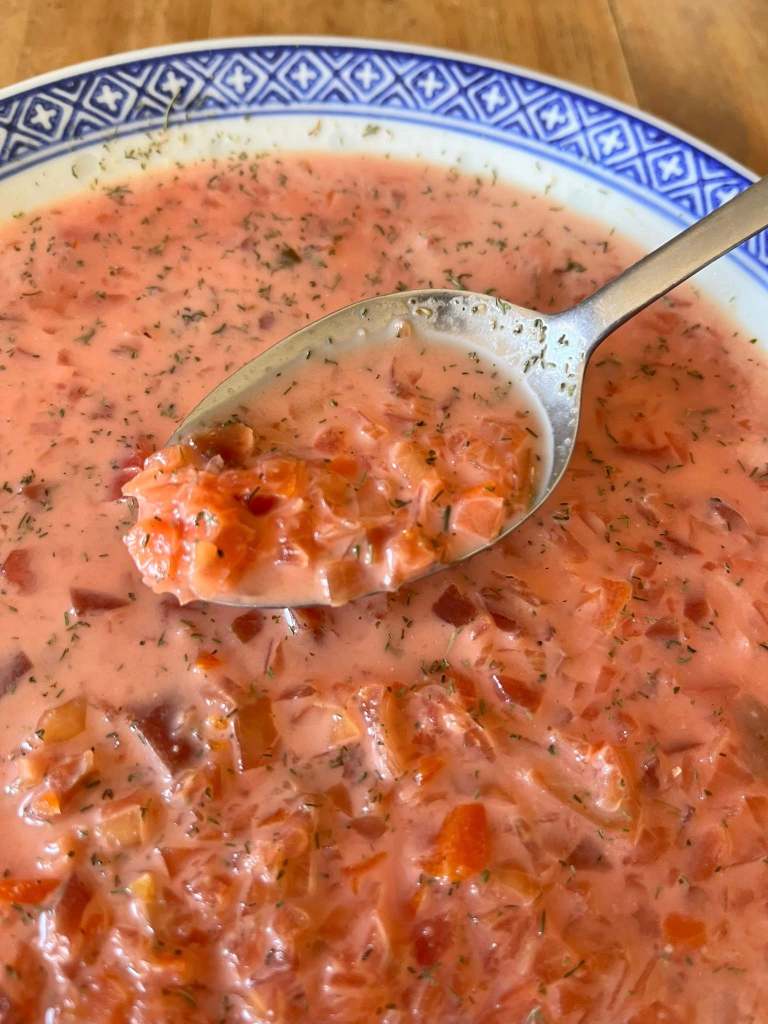 To serve in a bowl, pour in a some heavy cream at the bottom, ladle your pipping hot soup over top, and add dill if desired, hubby does not like dill on his, i like dill on mine. If desired instead, place a spoon of sour cream on top with fresh dill if you have it.