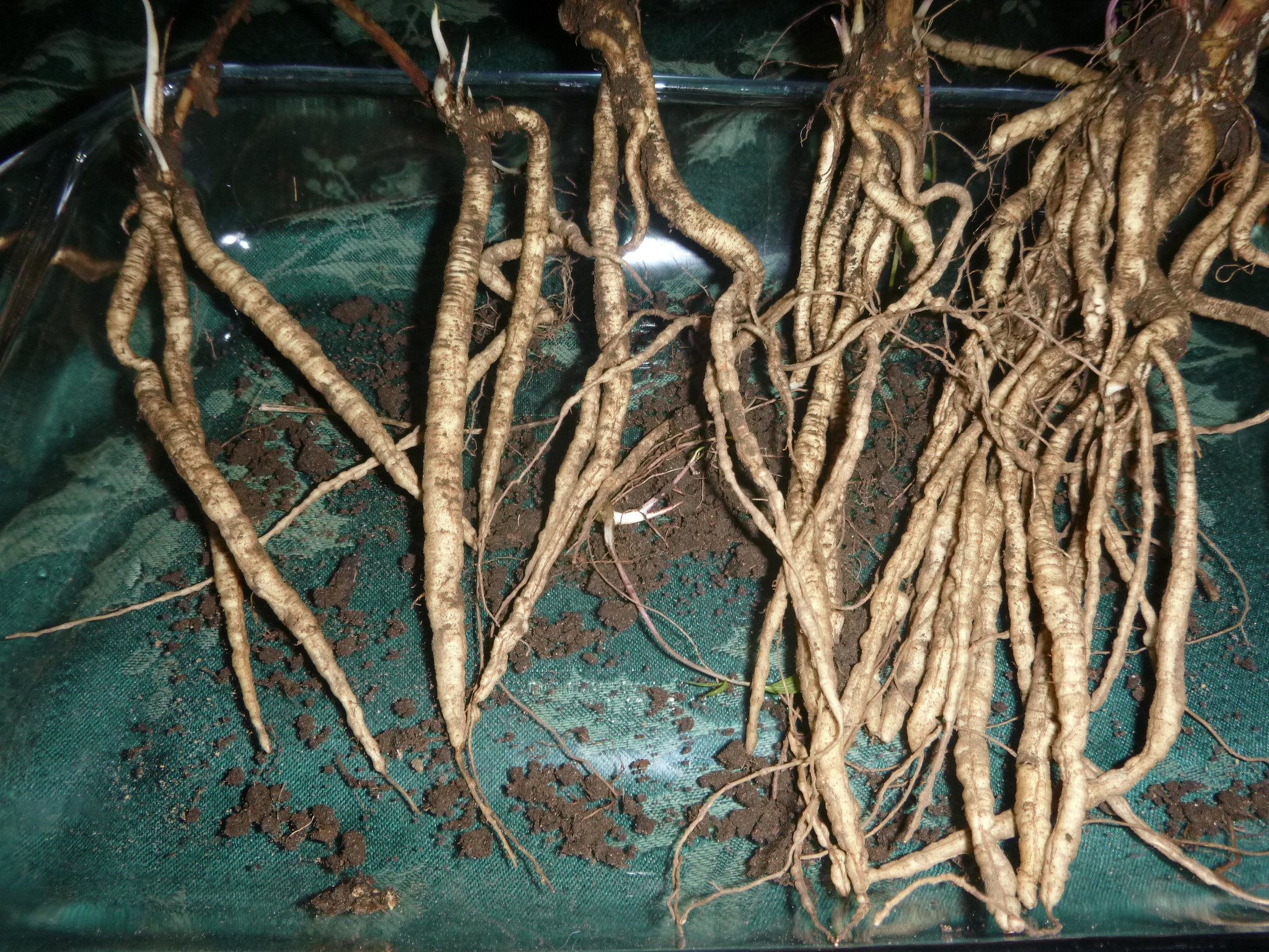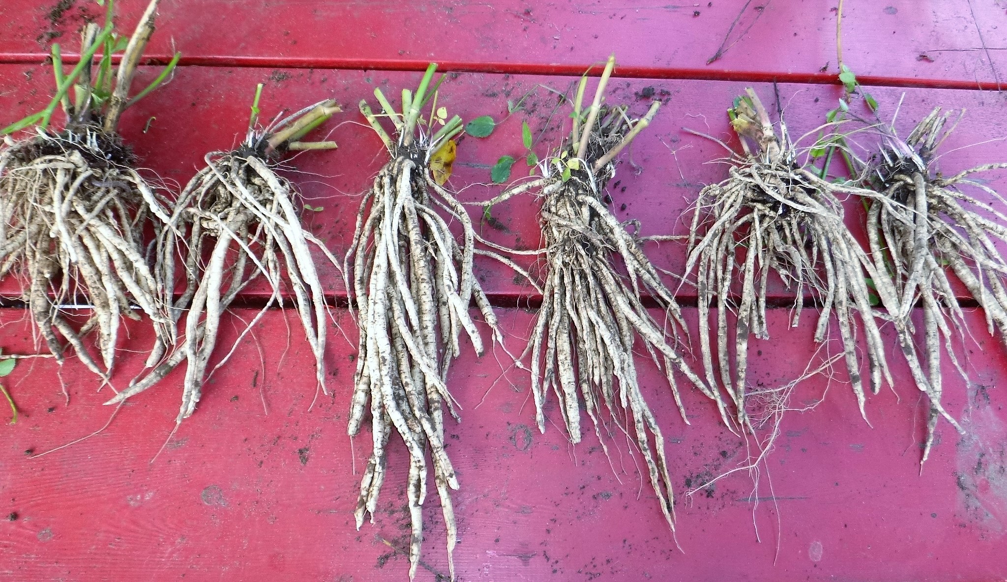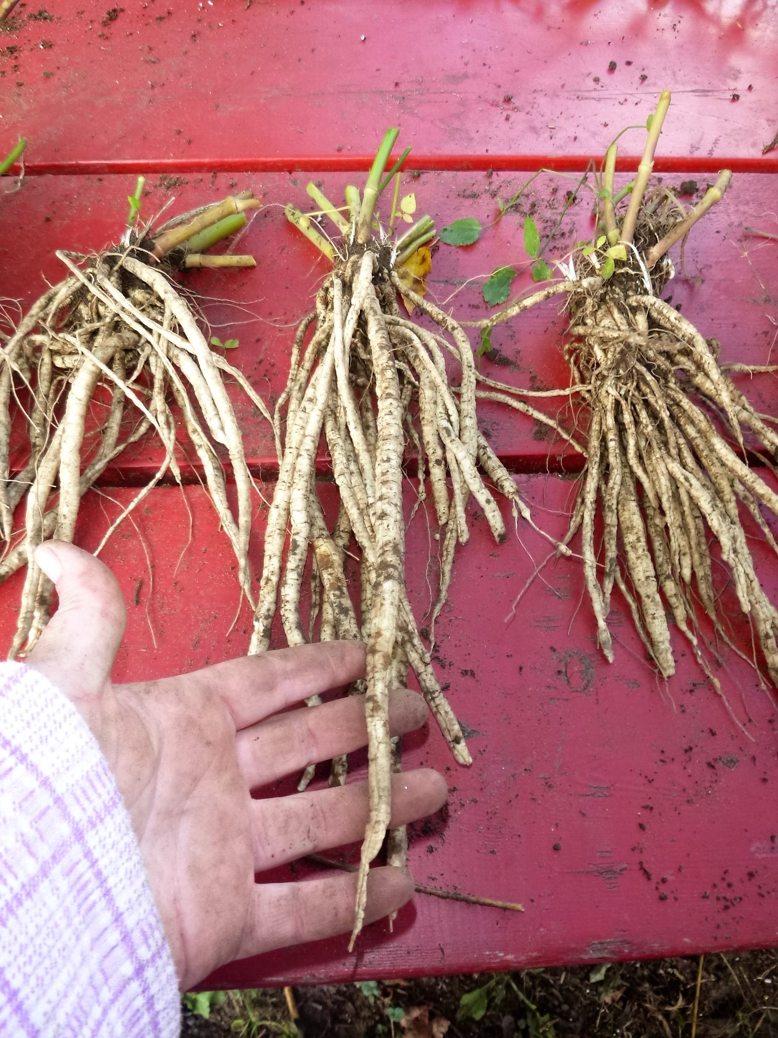 For the wee splits, I did not harvest any root off of them, you can see them on the left, starting with six, we split out the babies and replanted three rows of 5 plants each, we needed to move them to a new bed, which is very rich but perhaps not as well dug, we will see if that has a effect next year, for the larger plants, I took up to a third of their biggest roots and then replanted