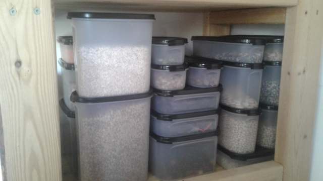 Veggies- A small mix of standard fresh from my last food baskets (maybe a weeks worth?, 10 days on oranges?), lots of squash, pumpkins, parsnips, turnips and then frozen, dried or canned.. Small amount of radish being grown, greens being grown/mico greens and spouting of course