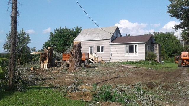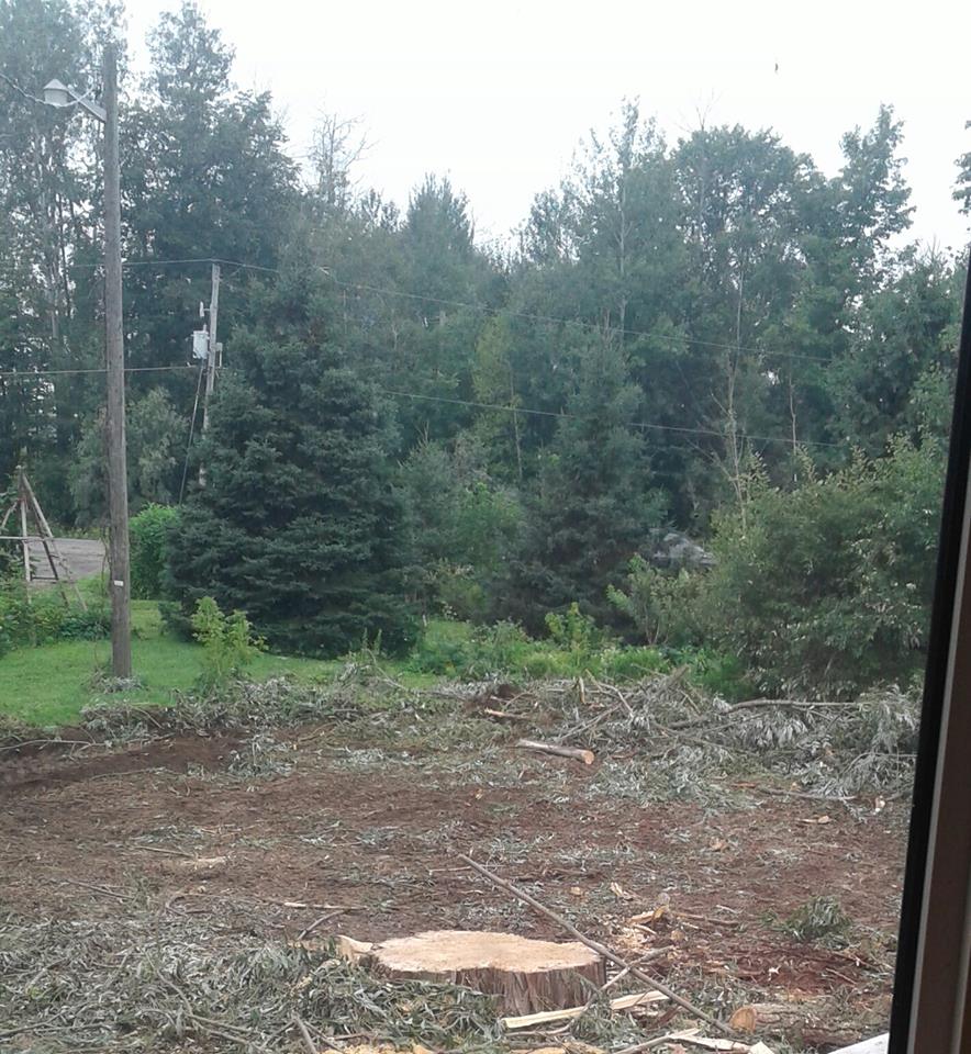 It was a good one and we both had to admit that it was a relief that the big old tree’s were down as we did not need to worry about them coming down.Β We got a short hard storm, we got 1 and half inches of rain in 20 minutes, we got high winds and we got some really good cracks of lightning and thunder over top us but it would appear that the worst went past us, there was recorded 120 km hour wind or wind gusts at the local town, it took of bolted down decks to give you an idea.Β There was a confirmed twister that took out two barns and there is reports of two more but it came down to an area that didn’t do damage to anything other than farmers fields.